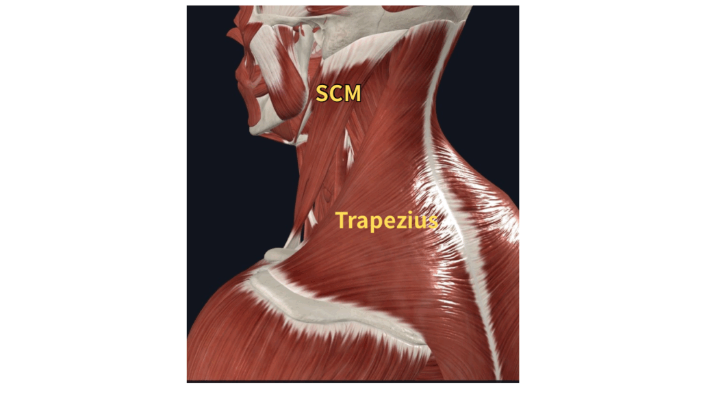 - 胸鎖乳突筋(きょうさにゅうとつきん) SCM: 首を曲げたり、回したりする筋肉です。