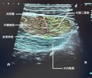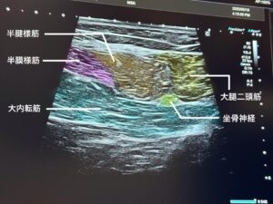 ハムストリングスの超音波エコーでは坐骨神経を中心に配置するのが基本です。