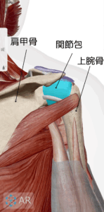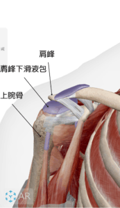 エクスターナルインピンジメント:肩を動かした際に滑液包などの組織が肩甲骨の肩峰とぶつかり、痛みを引き起こした状態。関節外の異常